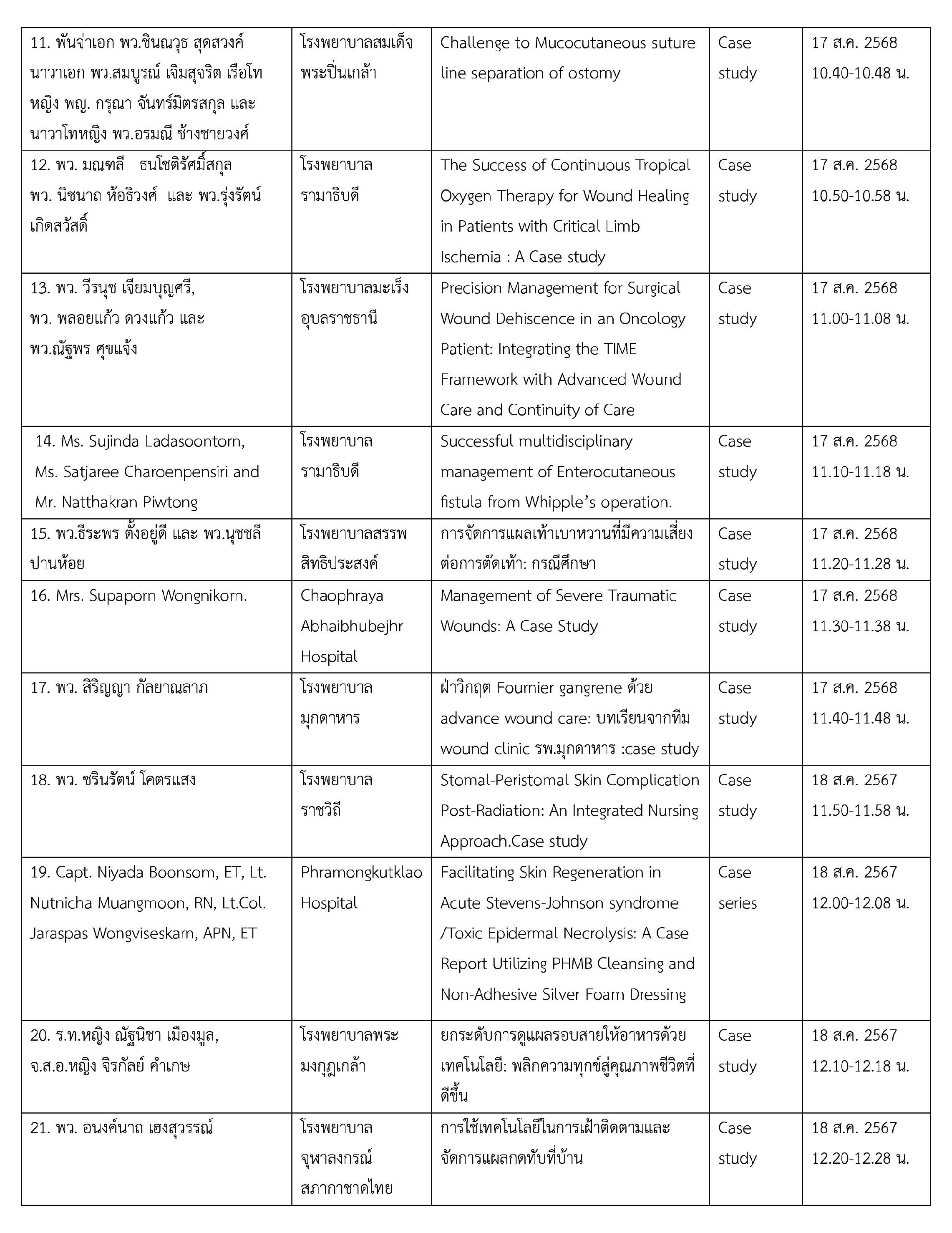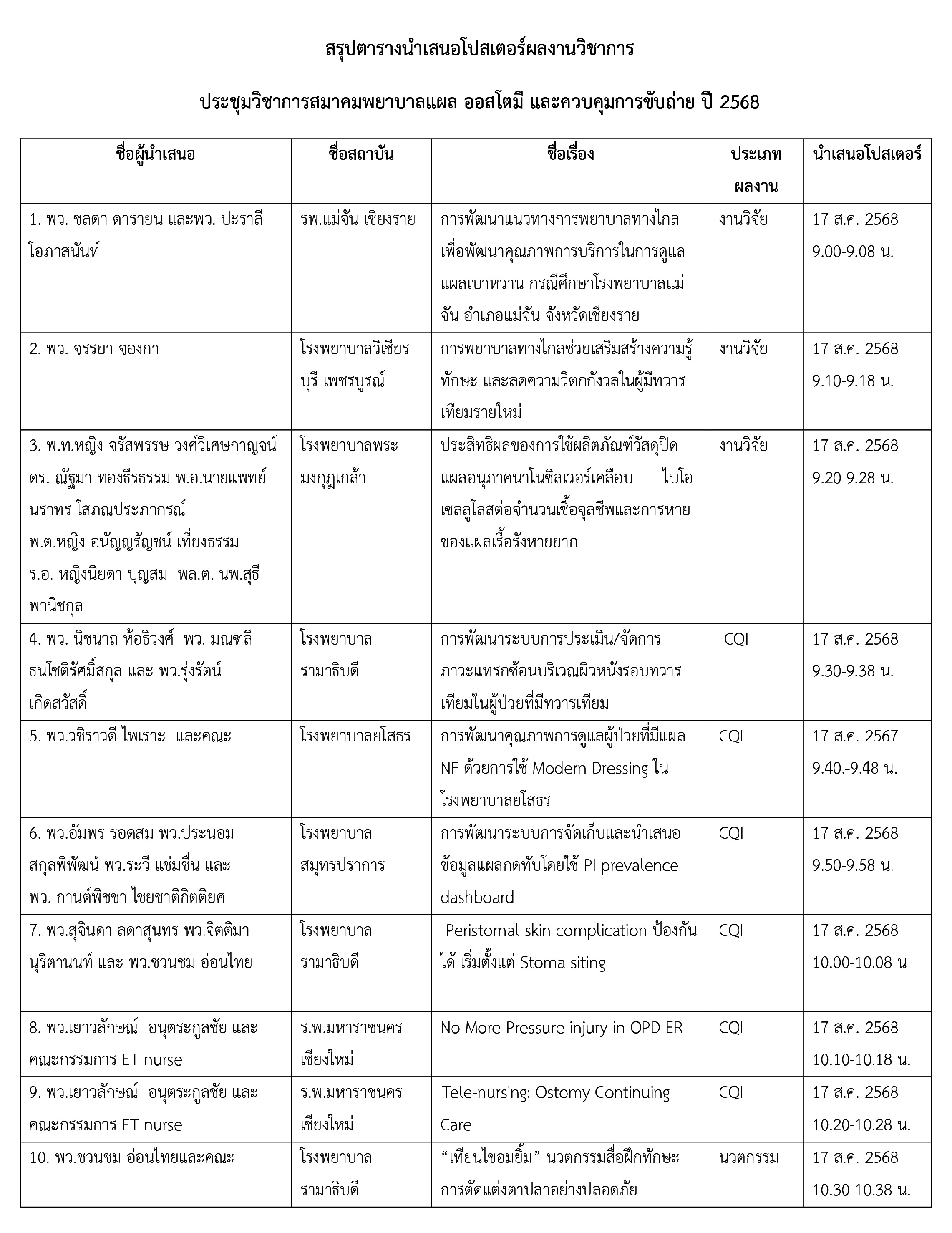 สรุปตารางนำเสนอโปสเตอร์ผลงานวิชาการ ประชุมวิชาการสมาคมพยาบาลแผล ออสโตมี และควบคุมการขับถ่าย ปี 2568
