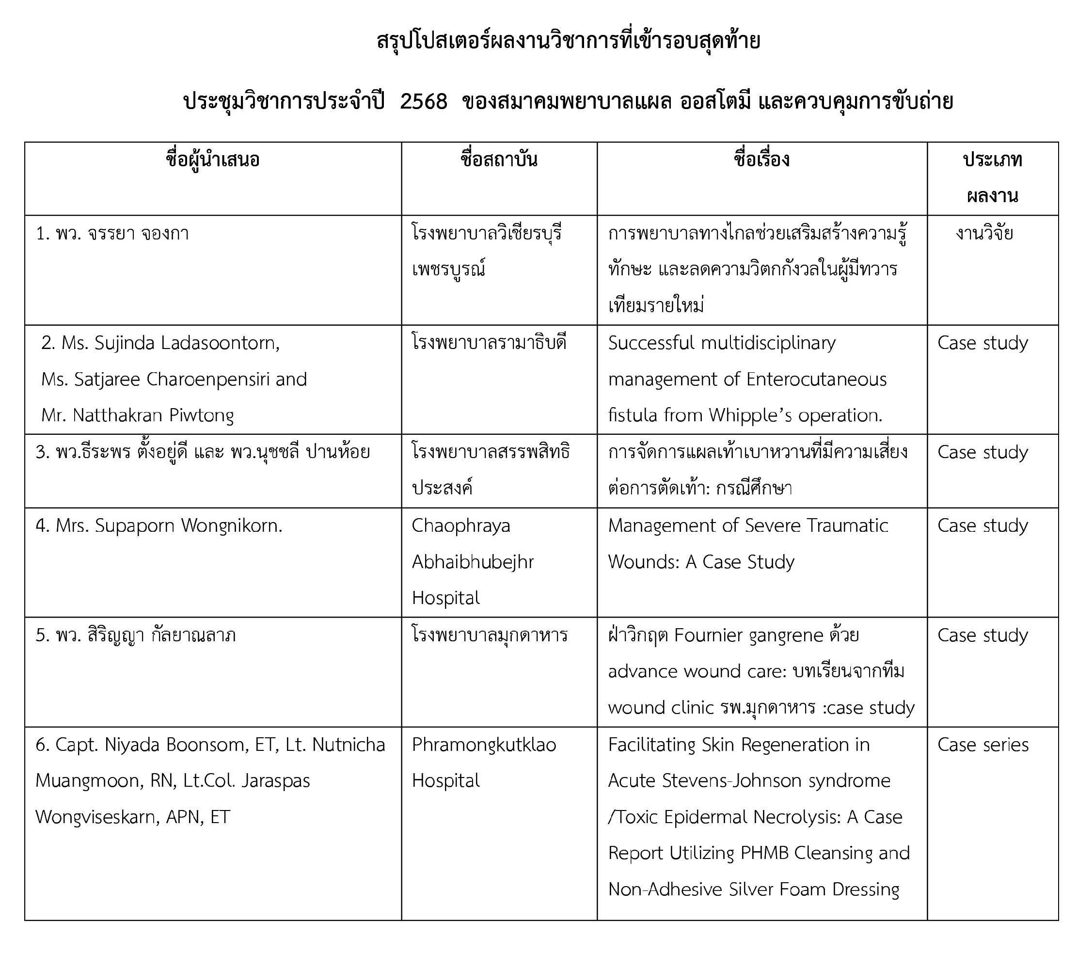 สรุปโปสเตอร์ผลงานวิชาการที่เข้ารอบสุดท้าย! ประชุมวิชาการสมาคมพยาบาลแผล ออสโตมี และควบคุมการขับถ่าย ปี 2568