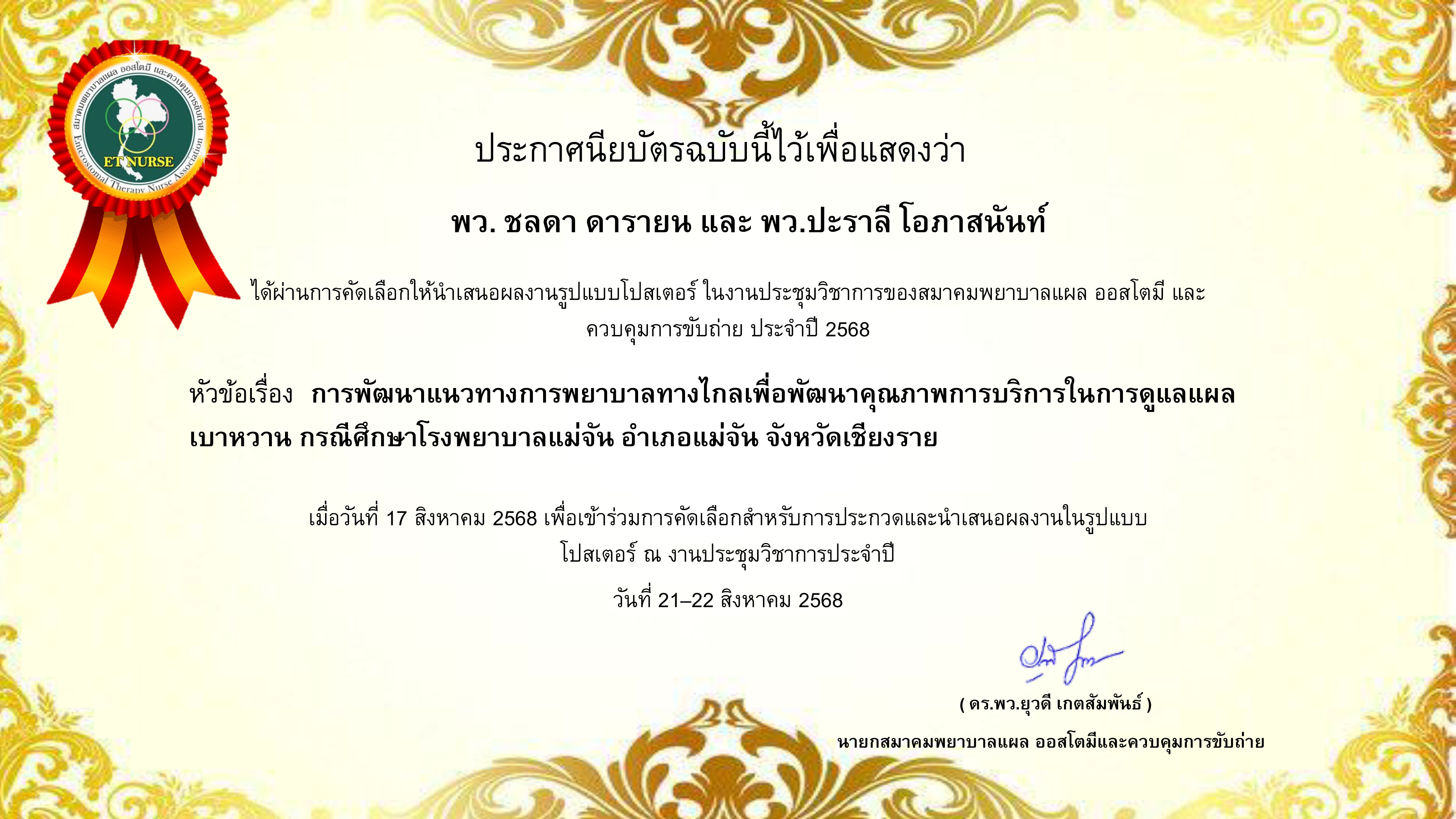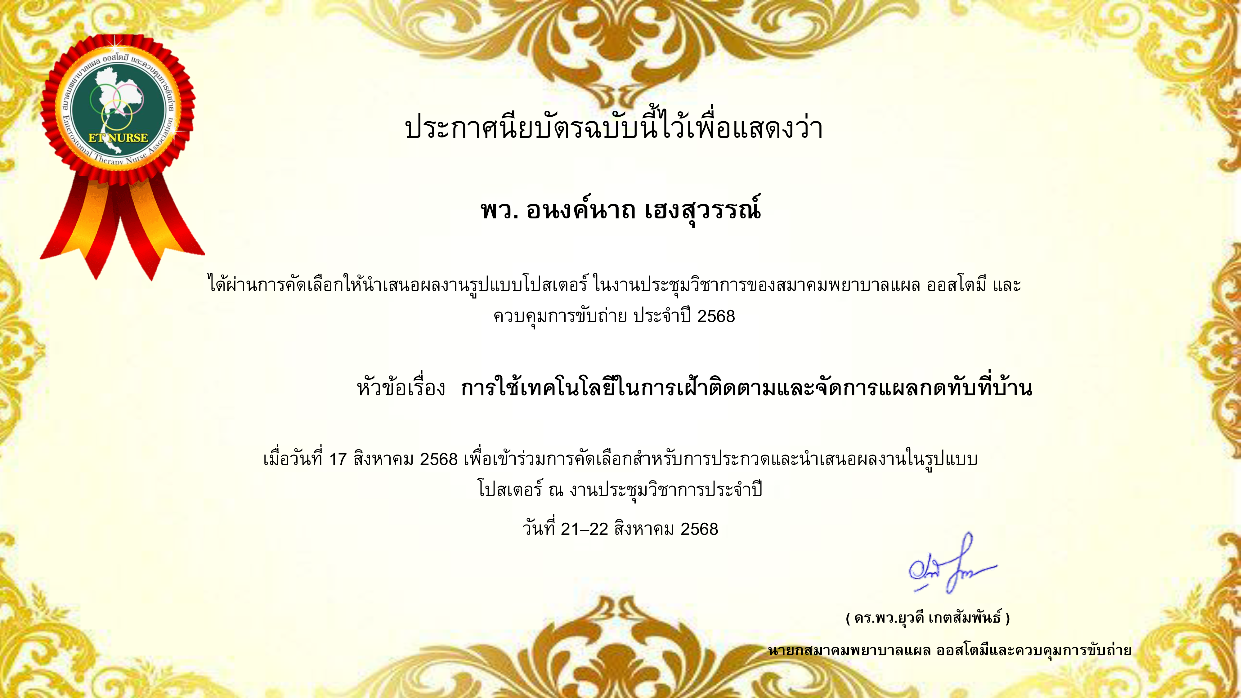 | 21 | พว. อนงค์นาถ เฮงสุวรรณ์ | โรงพยาบาลจุฬาลงกรณ์ สภากาชาดไทย | การใช้เทคโนโลยีในการเฝ้าติดตามและจัดการแผลกดทับที่บ้าน | Download |