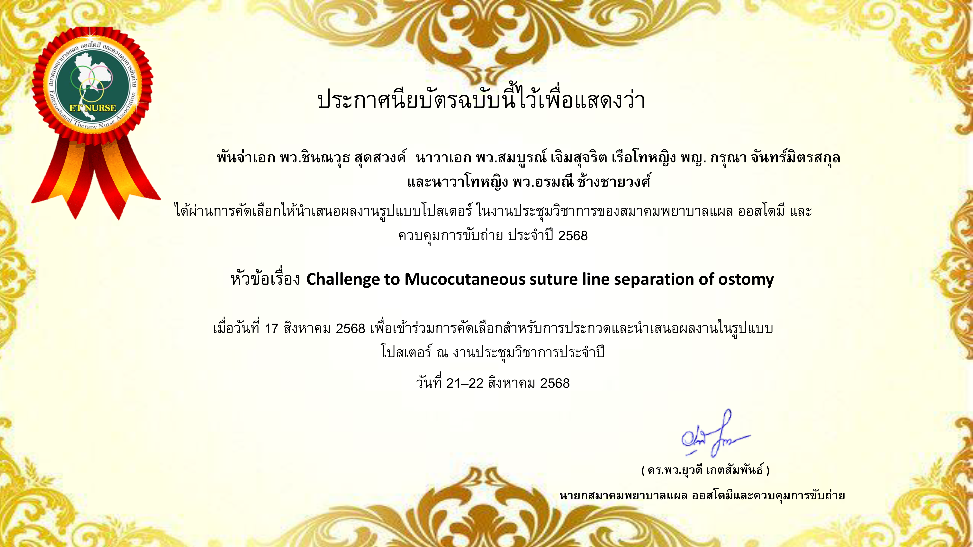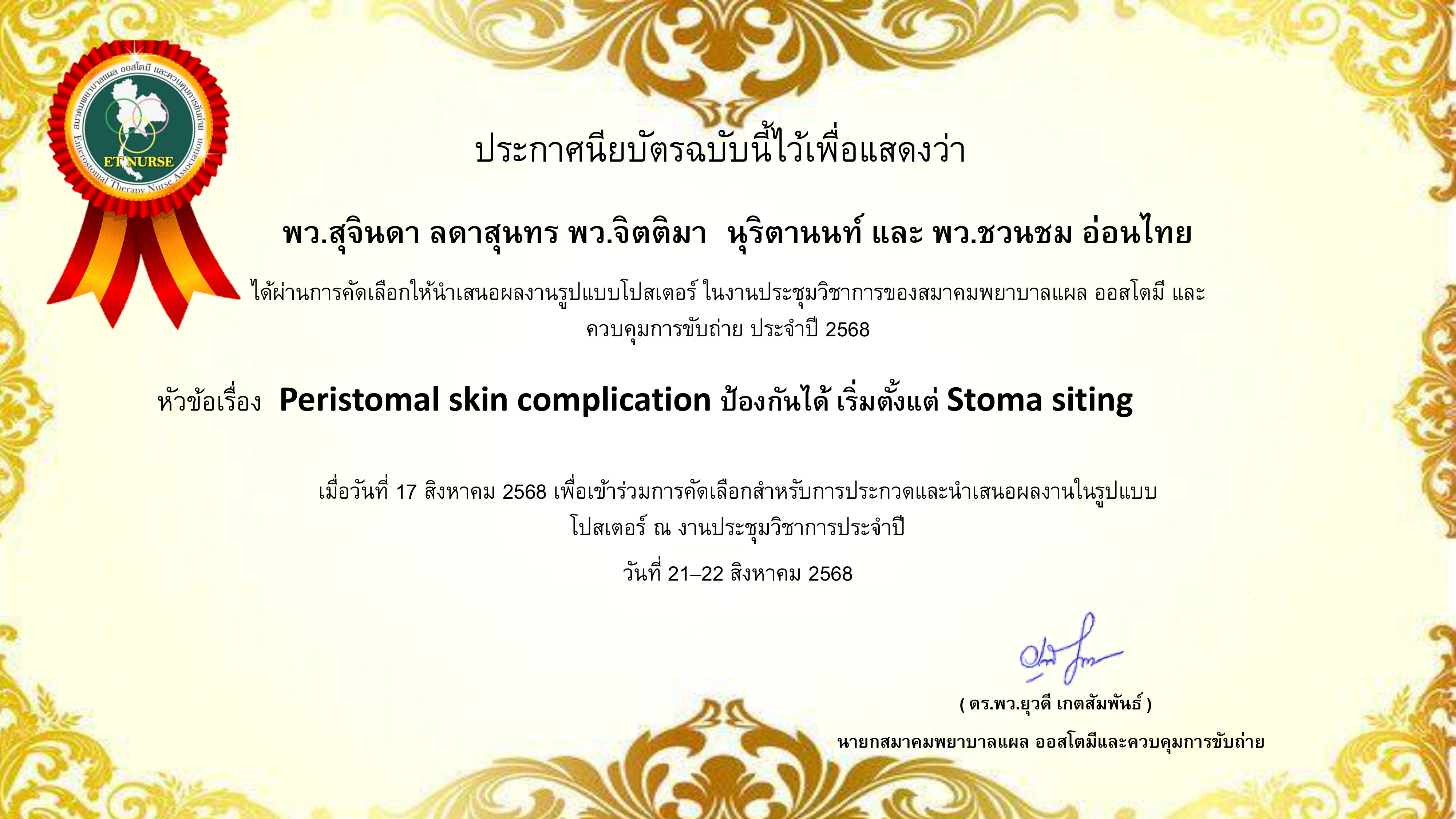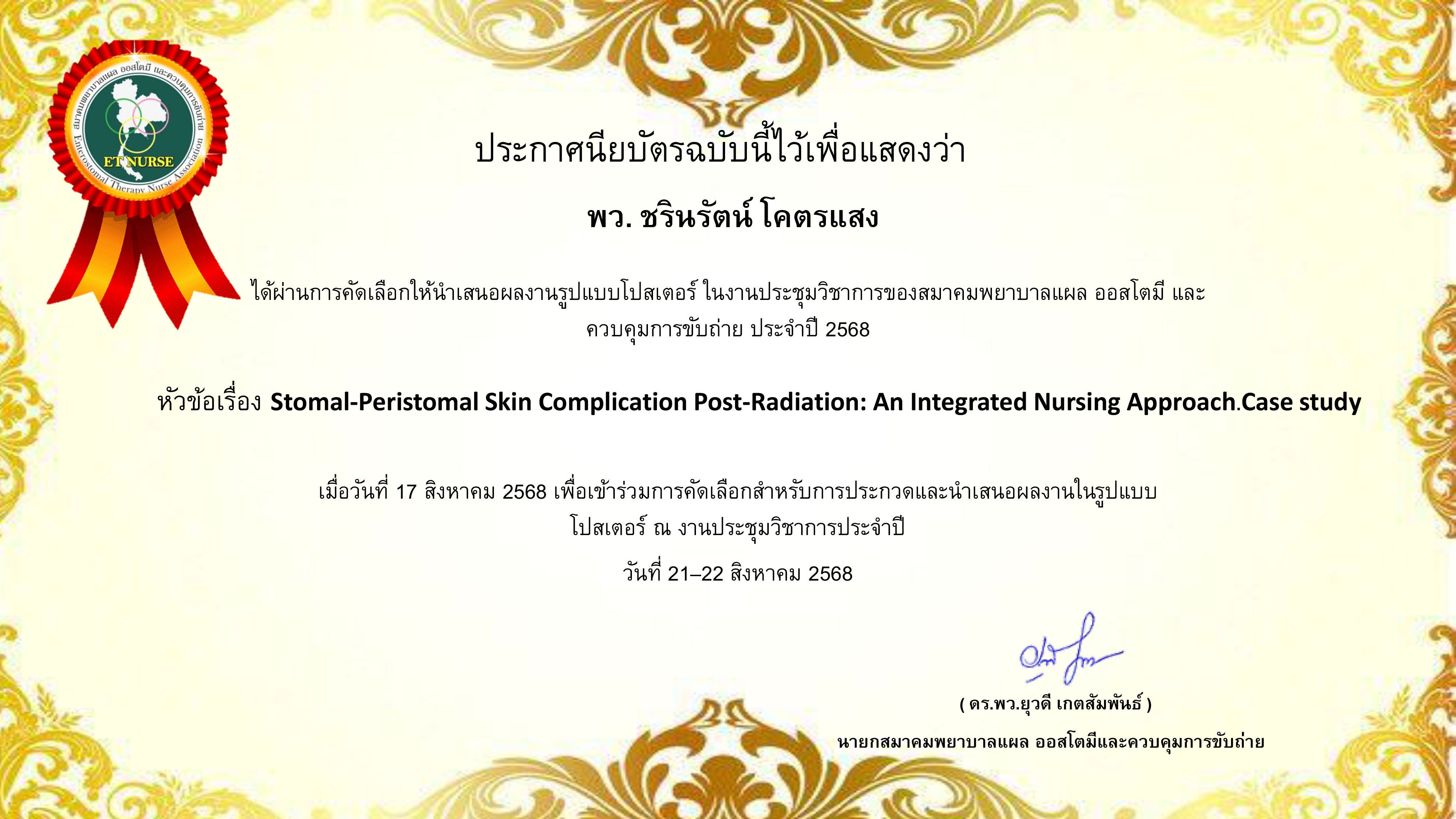 | 18 | พว. ชรินรัตน์ โคตรแสง | โรงพยาบาลราชวิถี | Stomal-Peristomal Skin Complication Post-Radiation: An Integrated Nursing Approach.Case study | Download |