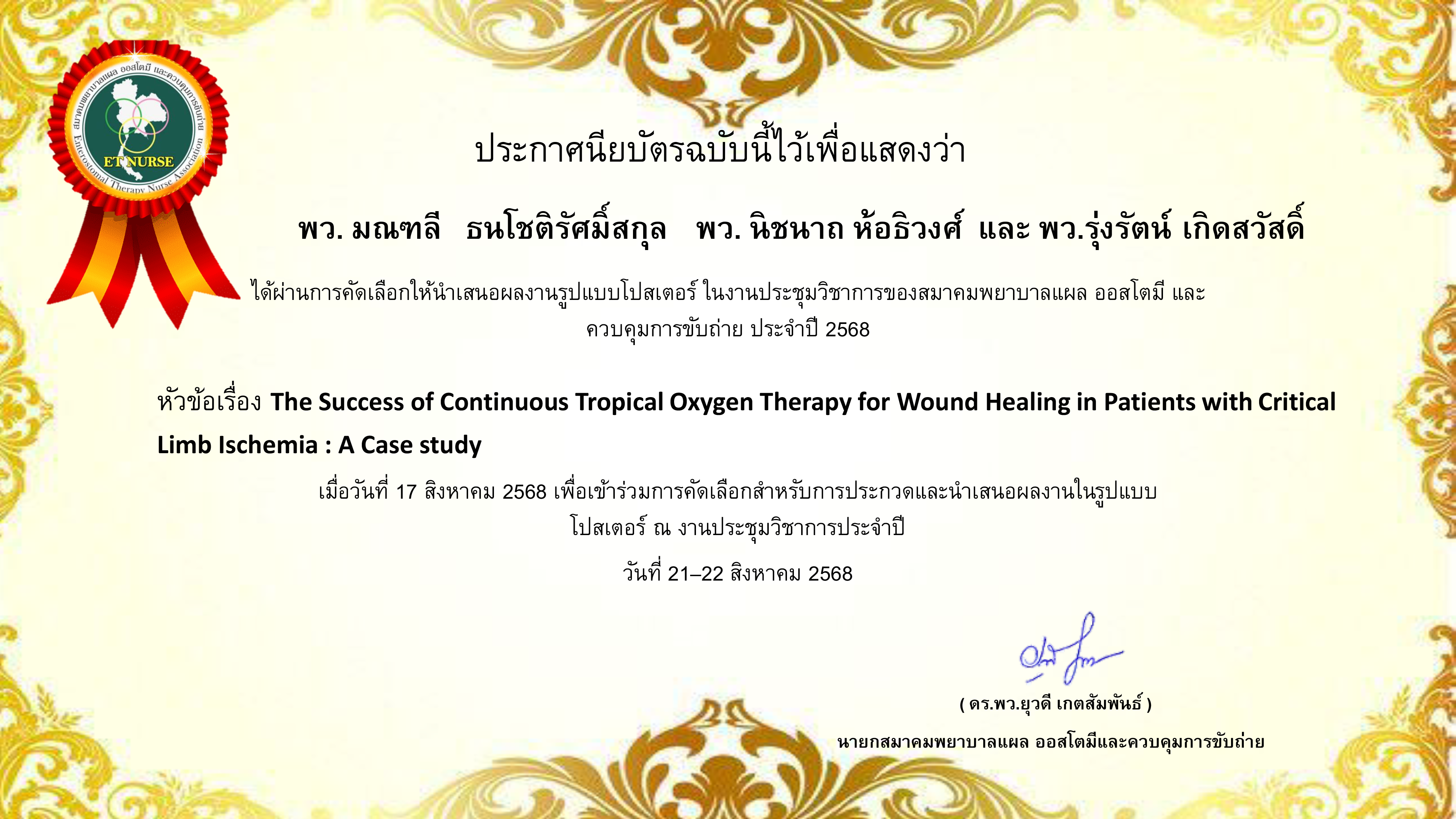 โรงพยาบาลรามาธิบดี | The Su The Success of Continuous Tropical Oxygen Therapy for Wound Healing in Patients with Critical Limb Ischemia : A Case study | Download |
