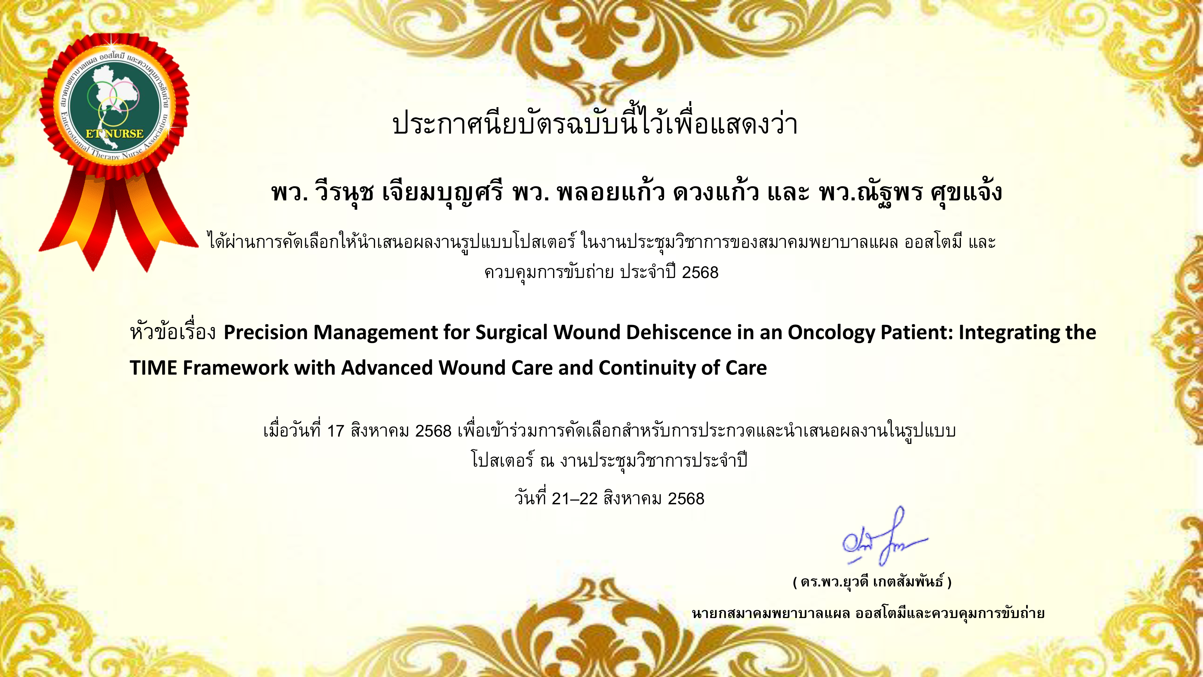 โรงพยาบาลมะเร็งอุบลราชธานี | Precision Management for Surgical Wound Dehiscence in an Oncology Patient: Integrating the TIME Framework with Advanced Wound Care and Continuity of Care | Download |