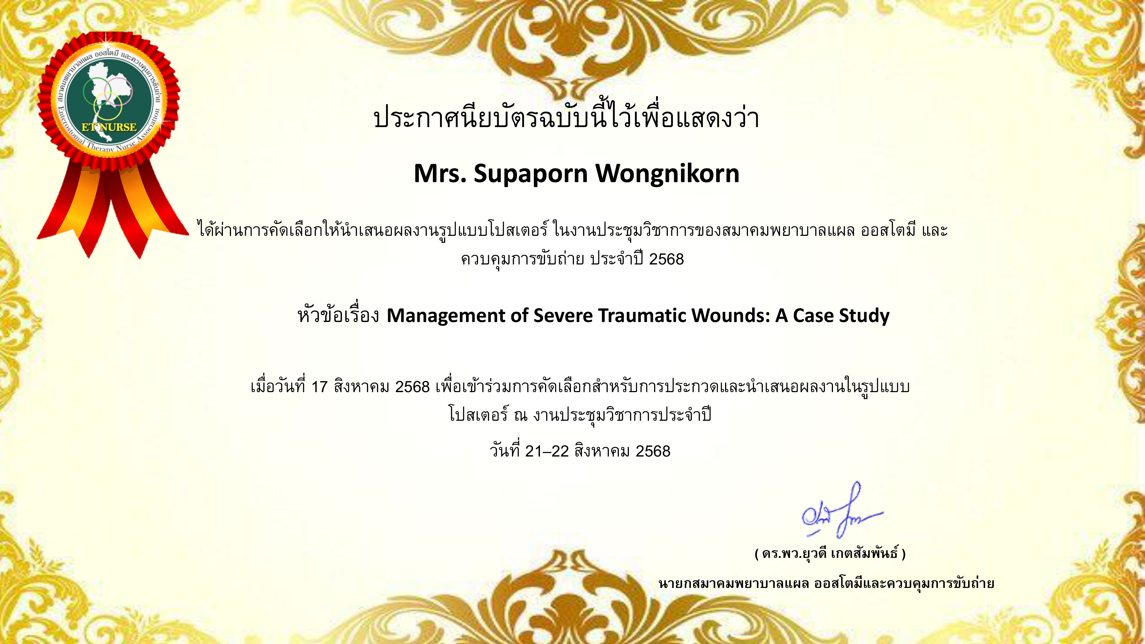 | 16 | Mrs. Supaporn Wongnikorn. | Chaophraya Abhaibhubejhr Hospital | Management of Severe Traumatic Wounds: A Case Study | Download |
