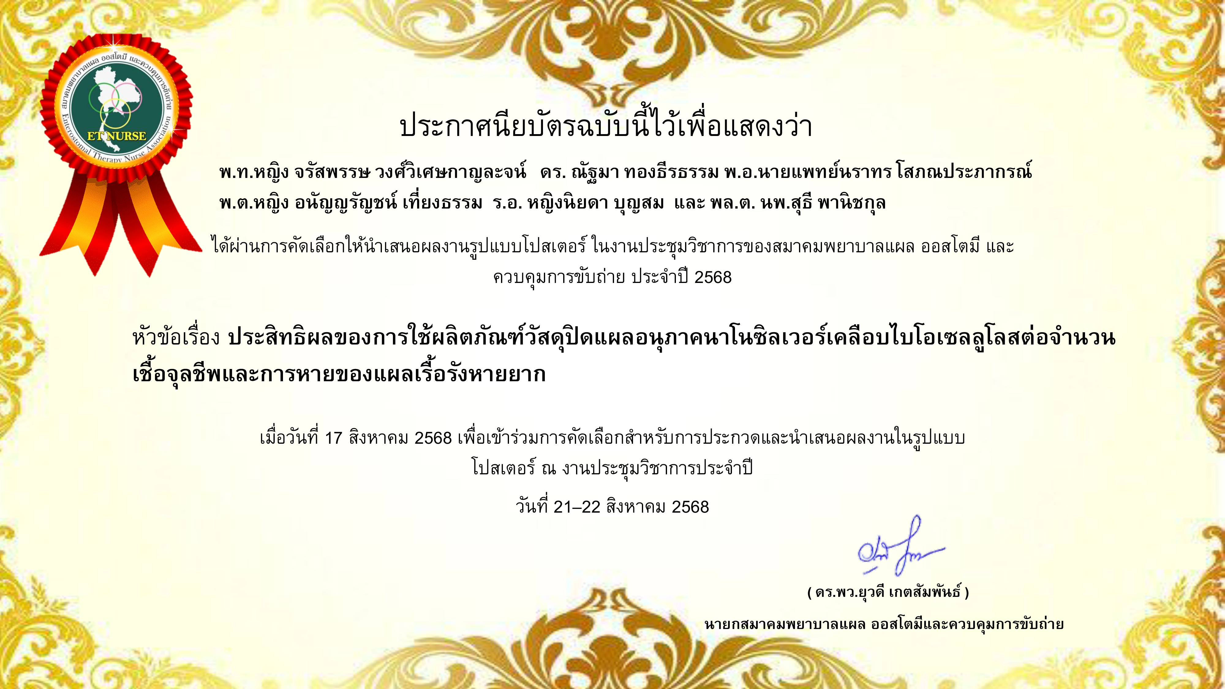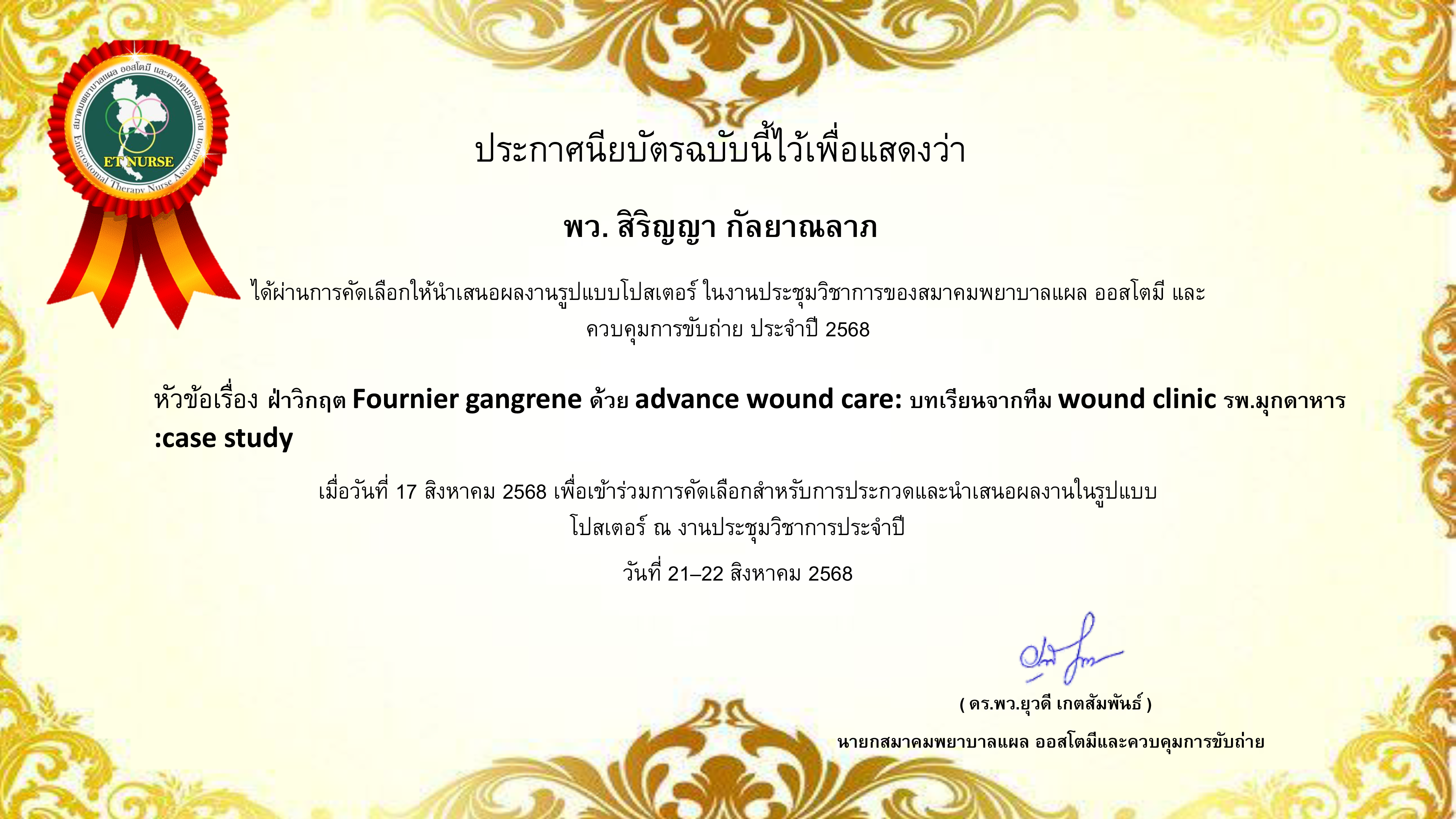 | 17 | พว. สิริญญา กัลยาณลาภ | โรงพยาบาลมุกดาหาร | ฝ่าวิกฤต Fournier gangrene ด้วย advance wound care: บทเรียนจากทีม wound clinic รพ.มุกดาหาร :case study | Download |