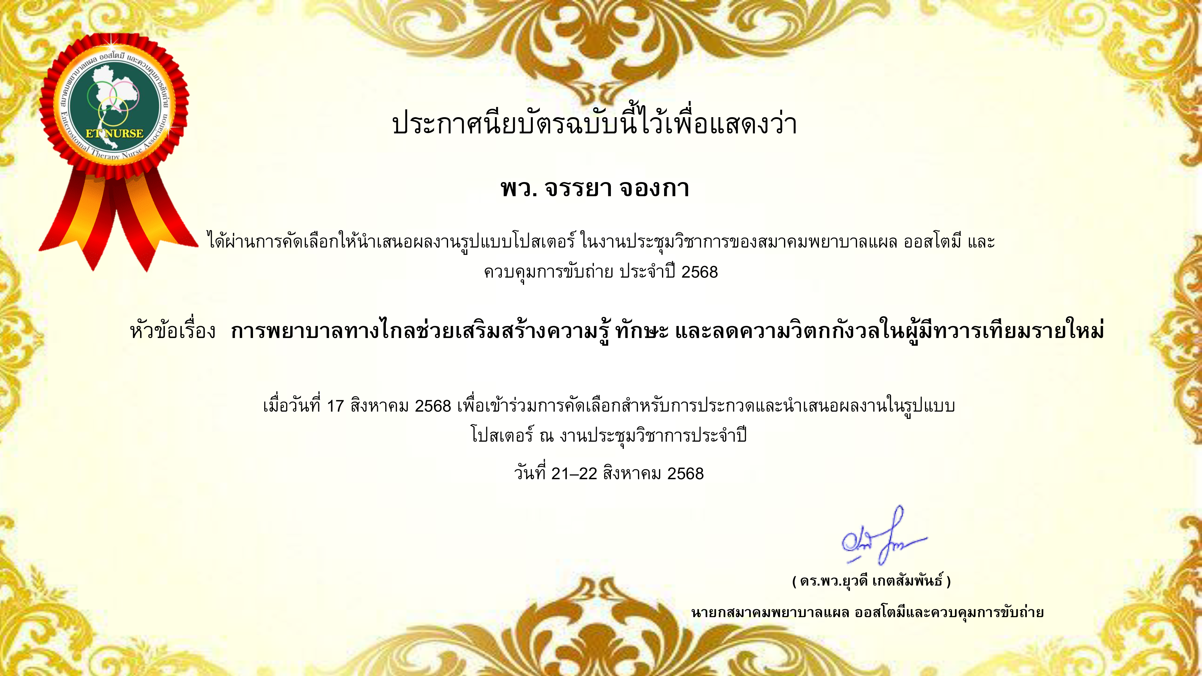| 2 | พว. จรรยา จองกา | โรงพยาบาลวิเชียรบุรี เพชรบูรณ์ | การพยาบาลทางไกลช่วยเสริมสร้างความรู้ทักษะ และลดความวิตกกังวลในผู้มีทวารเทียมรายใหม่ | Download |