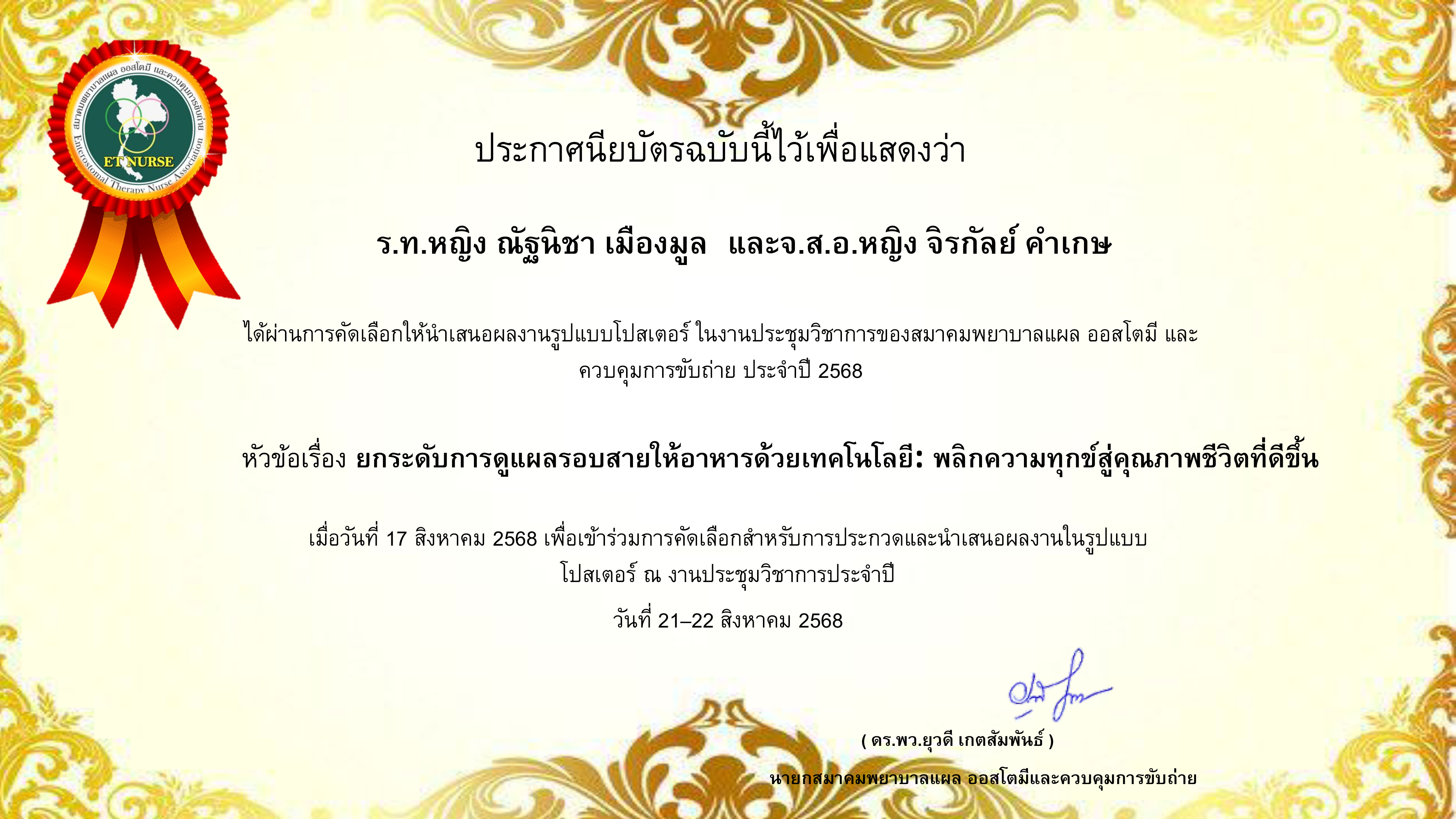 โรงพยาบาลพระมงกุฎเกล้า | ยกระดับการดูแผลรอบสายให้อาหารด้วยเทคโนโลยี: พลิกความทุกข์สู่คุณภาพชีวิตที่ดีขึ้น | Download |