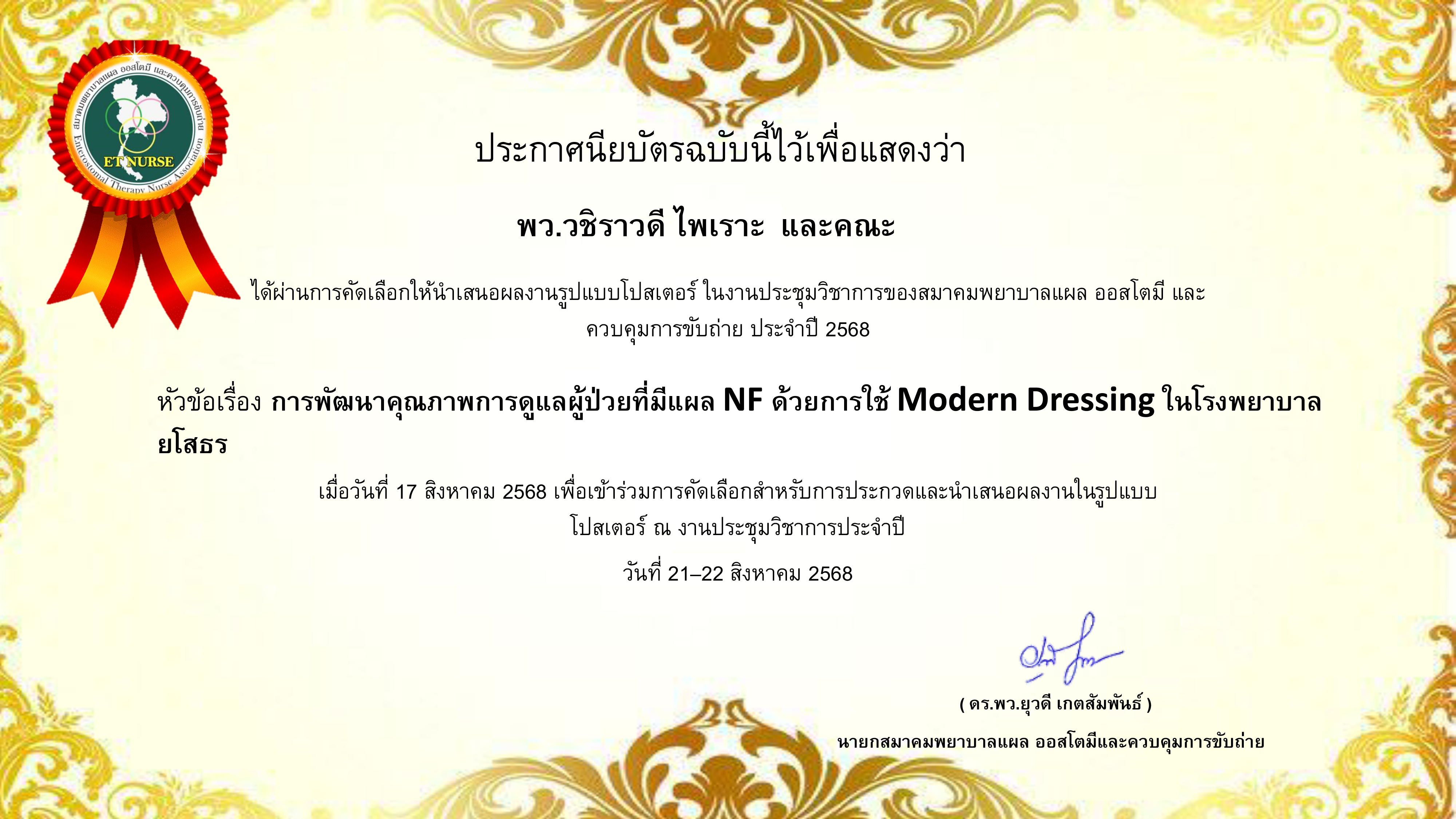 | 5 | พว.วชิราวดี ไพเราะ และคณะ | โรงพยาบาลยโสธร | การพัฒนาคุณภาพการดูแลผู้ป่วยที่มีแผล NF ด้วยการใช้ Modern Dressing ในโรงพยาบาลยโสธร | Download |